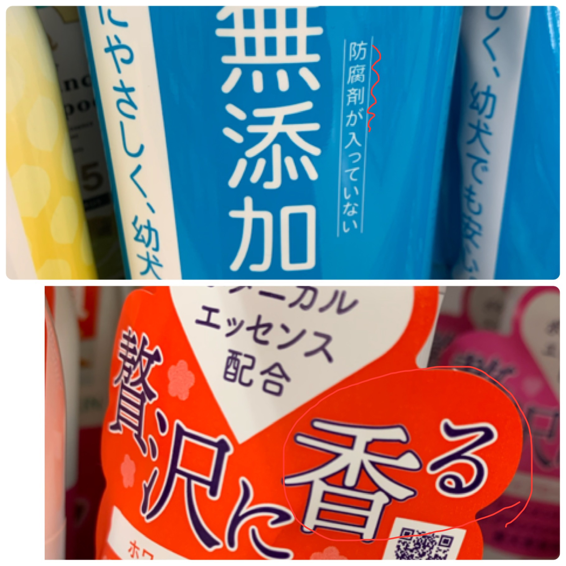 実際ペットコーナーで10種類以上のシャンプー剤の裏の表示を見てみました。有効成分や薬用成分、いい香り、つやつやの被毛、などの耳障りの良いうたい文句が並んでいるばかりで、肝心の原材料について書いてあるシャンプー剤は2種類ほどしかありませんでした。