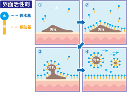 ①水に溶かした界面活性剤は、油汚れを浮かせ、汚れを水中に分散させて汚れをはがす。